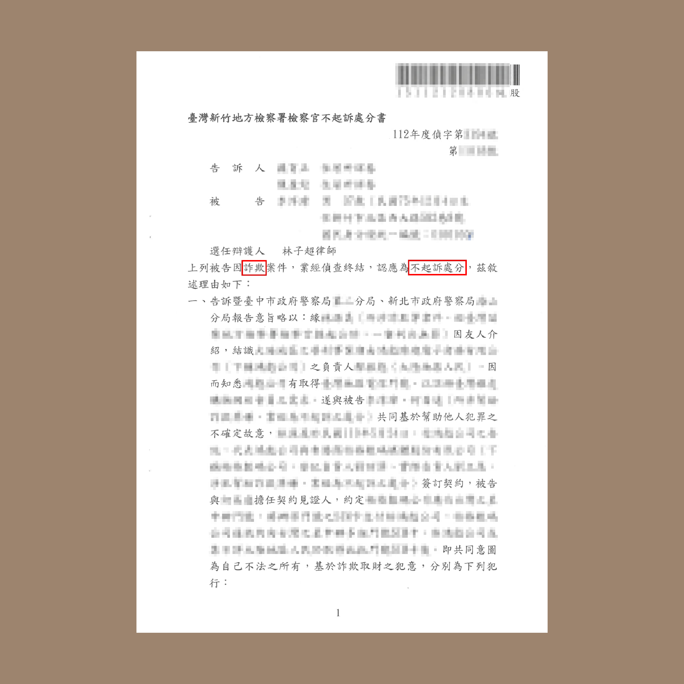 詐欺 – 不起訴處分書刑事事件 林子超律師2026 年 1 月 15 日刑事事件 首頁 勝訴案例 刑事事件 詐欺 – 不起訴處分書 112-12-29 當事人居中促成商業合作,並在商業合作契約中作為見證人,竟因合作糾紛遭提出詐欺刑事告訴。經本所林子超律師協助辯護,整理洽談及合作過程,提出證據說明脈絡,成功取得不起訴處分。
