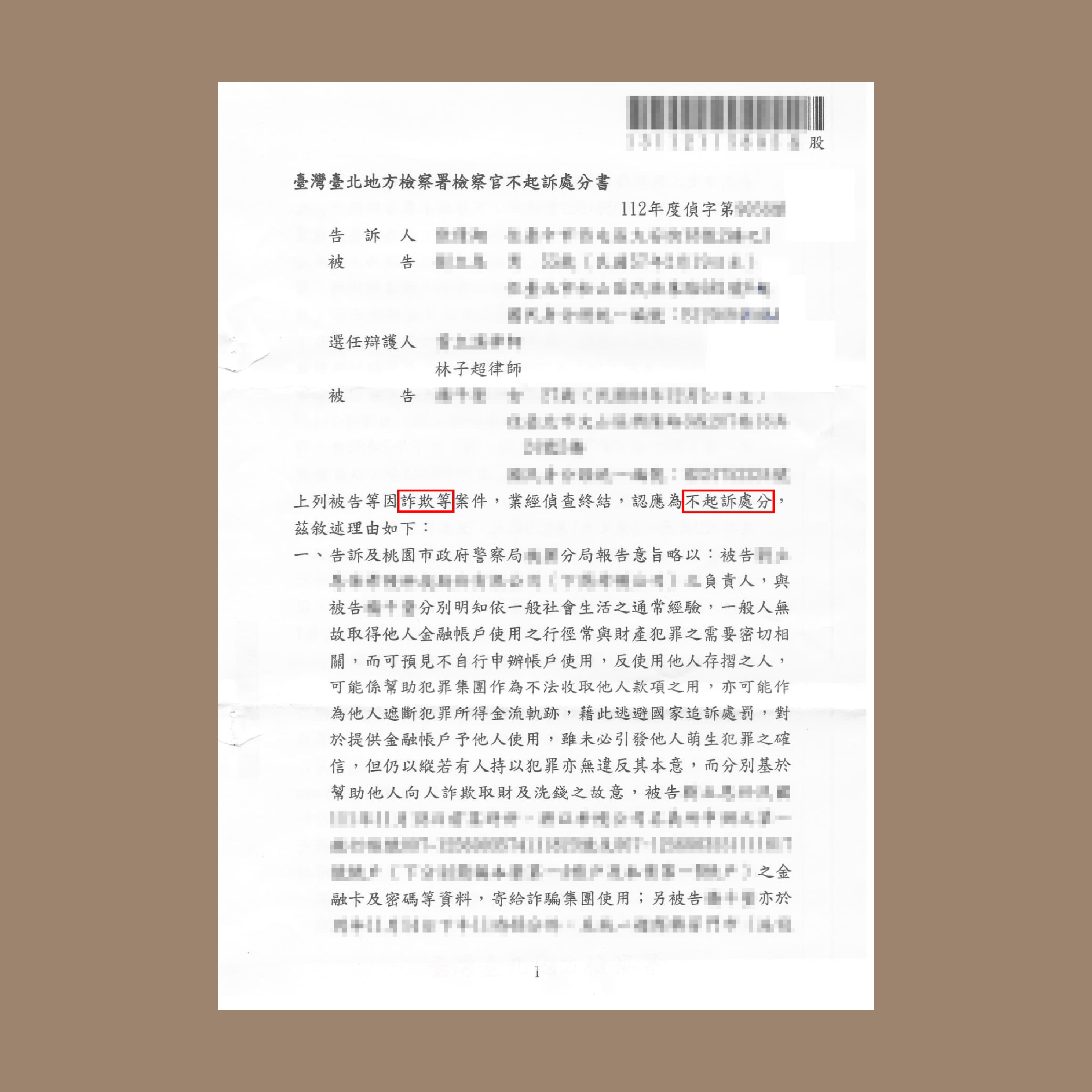 當事人因經營事業,銀行帳戶用於收取事業款項,竟受詐騙集團利用於「三方詐欺」手段,致使當事人銀行帳戶遭警示,並涉及詐欺與洗錢等罪嫌。經本所林子超律師協助辯護,說明「三方詐欺」並提出證據,成功取得不起訴處分。