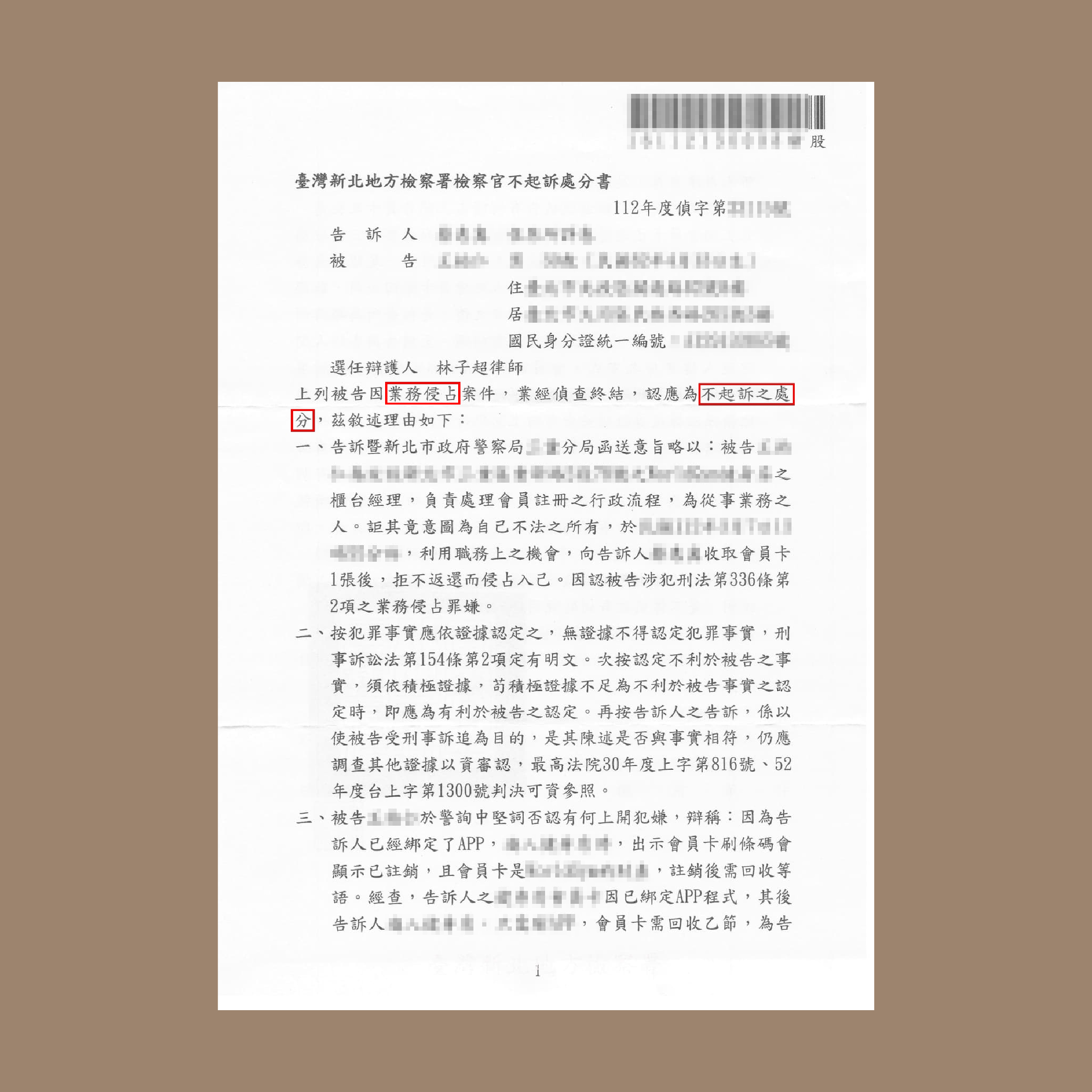 當事人為公司經理,處理消費者會員服務,竟因會員卡糾紛遭消費者提出業務侵占刑事告訴。經本所林子超律師協助辯護,說明民事法律關係及消費者保護條款,成功取得不起訴處分。