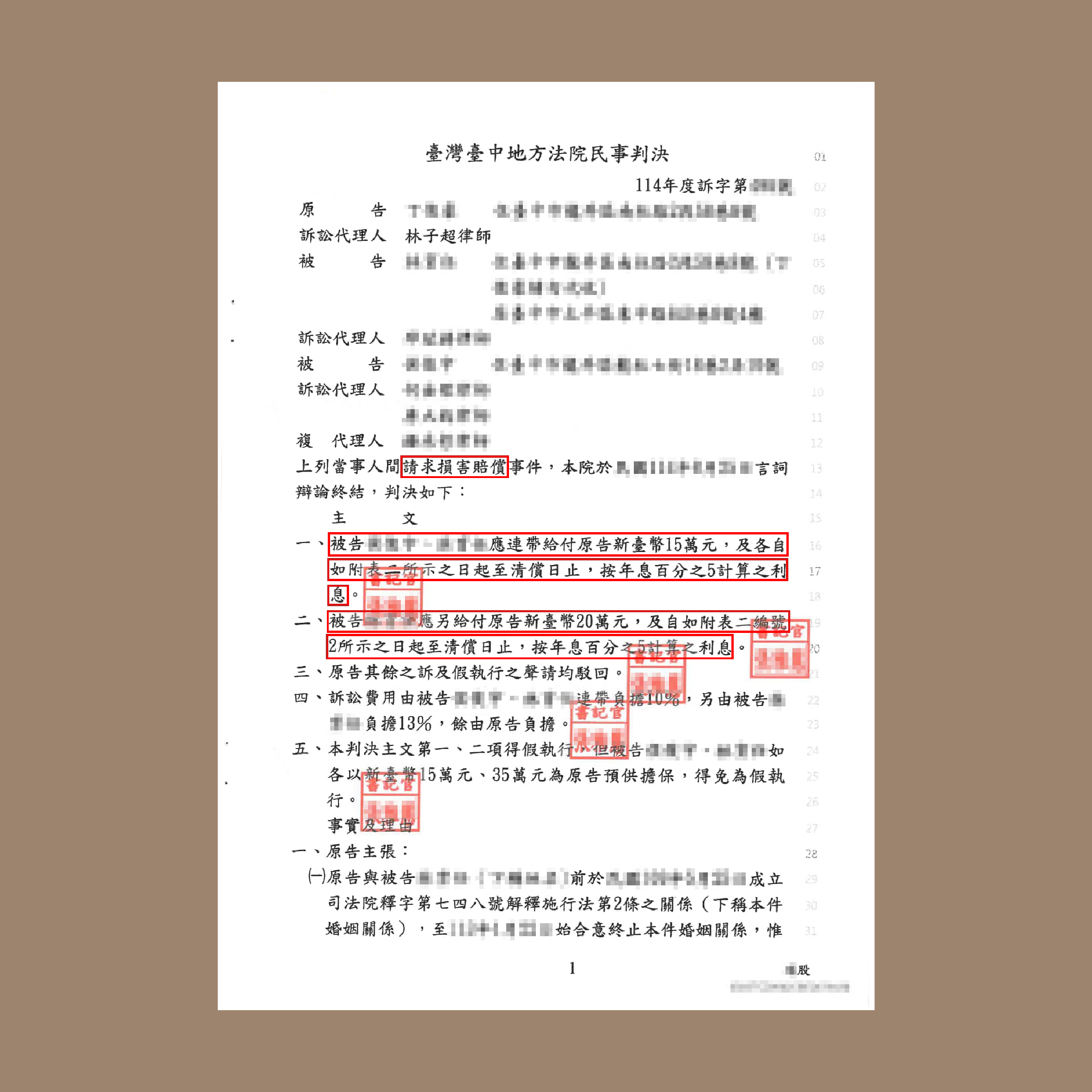 損害賠償 – 第一審民事判決家事事件 林子超律師2026 年 1 月 15 日家事事件 首頁 勝訴案例 家事事件 損害賠償 – 第一審民事判決 114-10-29 當事人的配偶與第三人從事性行為,委任本所林子超律師提起民事訴訟請求侵害身分法益損害賠償(俗稱侵害配偶權),證明配偶與第三人有從事性行為,應負連帶責任,成功取得民事賠償勝訴判決。